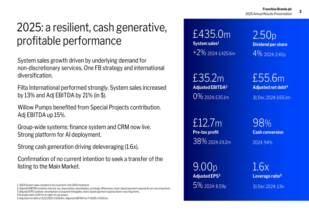 The shift at Franchise Brands PLC from an acquisitive growth model to one centred on operational leverage and capital returns marks a significant inflection point for the franchise water and waste services sector. The 15% reduction in adjusted net debt to £55.6 million, coupled with a leverage ratio of 1.6x, signals a deliberate pivot toward financial discipline rather than expansion at any cost. This deleveraging trajectory, guided by a board that has ruled out major acquisitions until at least 2028, reframes what success looks like in water utility franchising—not through volume of acquisitions, but through cash flow optimisation and margin consistency.