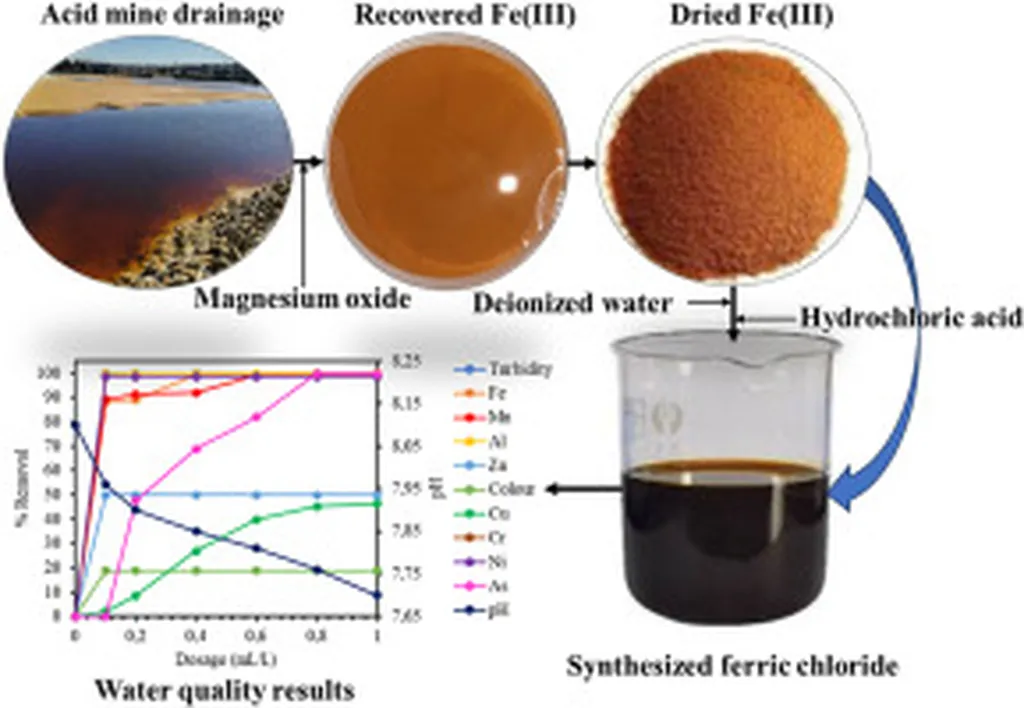 That precipitate was then dissolved in hydrochloric acid to produce ferric chloride (FeCl₃)—a coagulant widely used in water treatment to remove turbidity, heavy metals, and pathogens. When tested on South African river water, the AMD-synthesized FeCl₃ achieved over 99% removal of turbidity, iron, and aluminum under optimized conditions (0.2 mL/L dose, 100 rpm mixing, 5-minute contact time), fully complying with South African National Standards (SANS 241) for potable water.